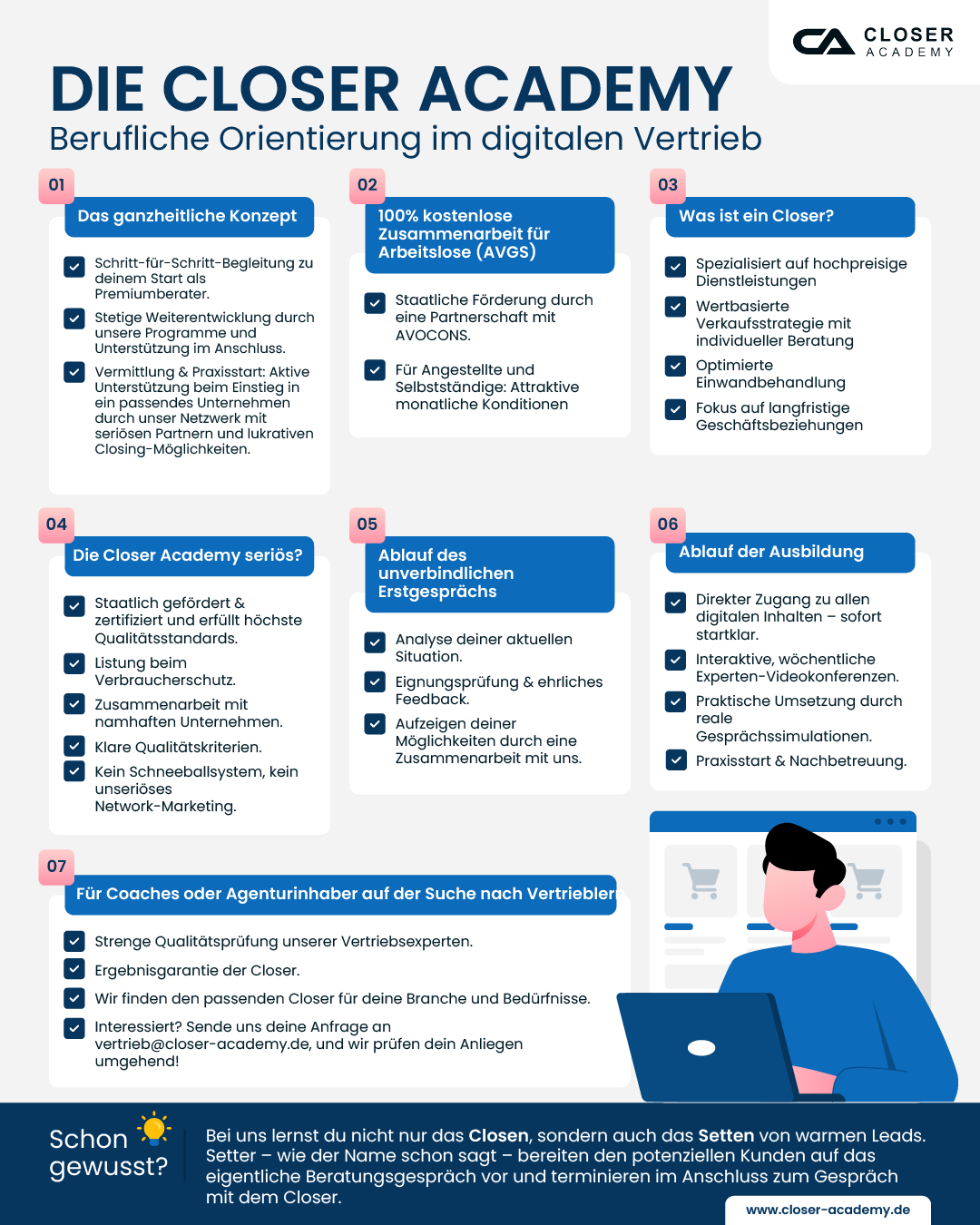 Ein seriöses Closer-Coaching beinhaltet echte Praxisphasen, nachweisbare Referenzen, zertifizierte Coaches und idealerweise eine Projektvermittlung.
