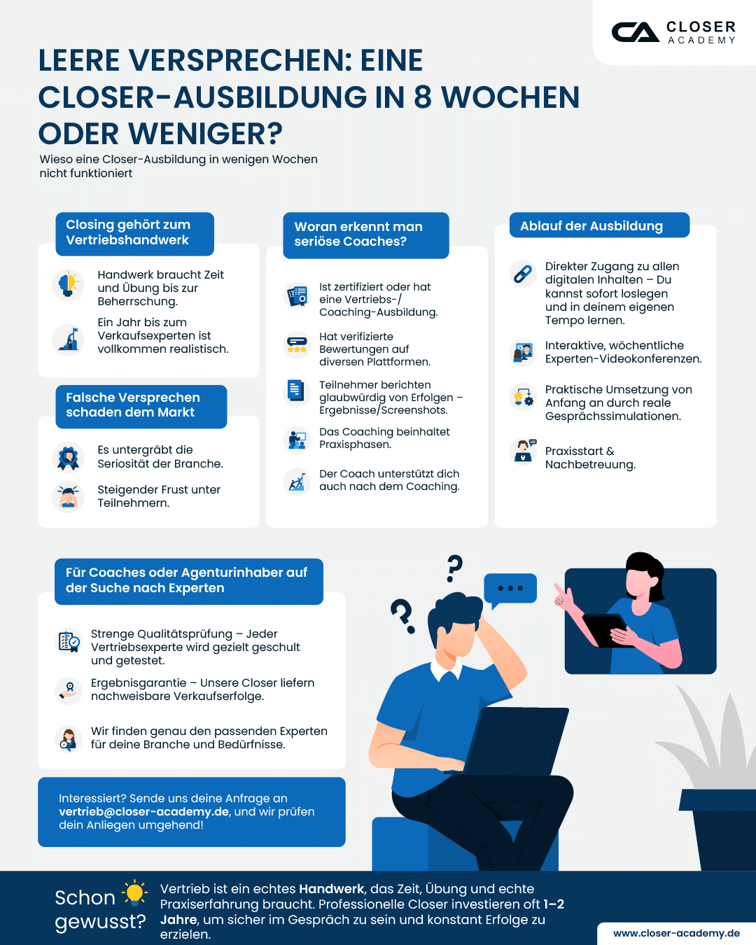 In diesem Artikel erfährst du, warum diese Versprechen unseriös sind, was ein Closer wirklich können muss und woran du ein seriöses Coaching erkennst.