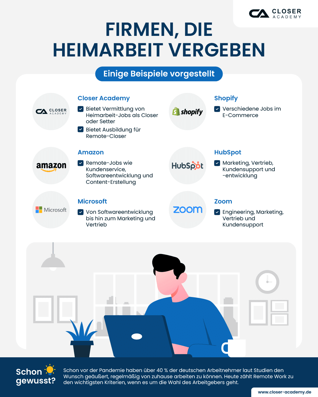 Infografik zeigt bekannte Firmen, die Heimarbeit ermöglichen – von E-Commerce bis Softwareentwicklung – und hebt die Closer Academy als Anbieter für Remote-Jobs und Ausbildungen im digitalen Vertrieb hervor.