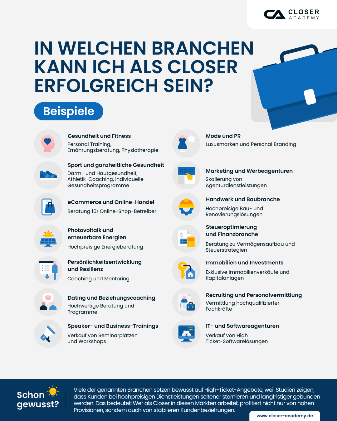 Der Closer ist kein anerkannter Ausbildungsberuf. Dennoch ist ein Coaching darin unerlässlich, wenn du schnellstmöglich Erfolge erzielen möchtest. Die Programme der Closer Academy sind flexibel gestaltet und können individuell an deinen Zeitplan angepasst werden. Ob und wann eine Vernetzung mit Unternehmen erfolgt, hängt von beiderseitigem Interesse ab.