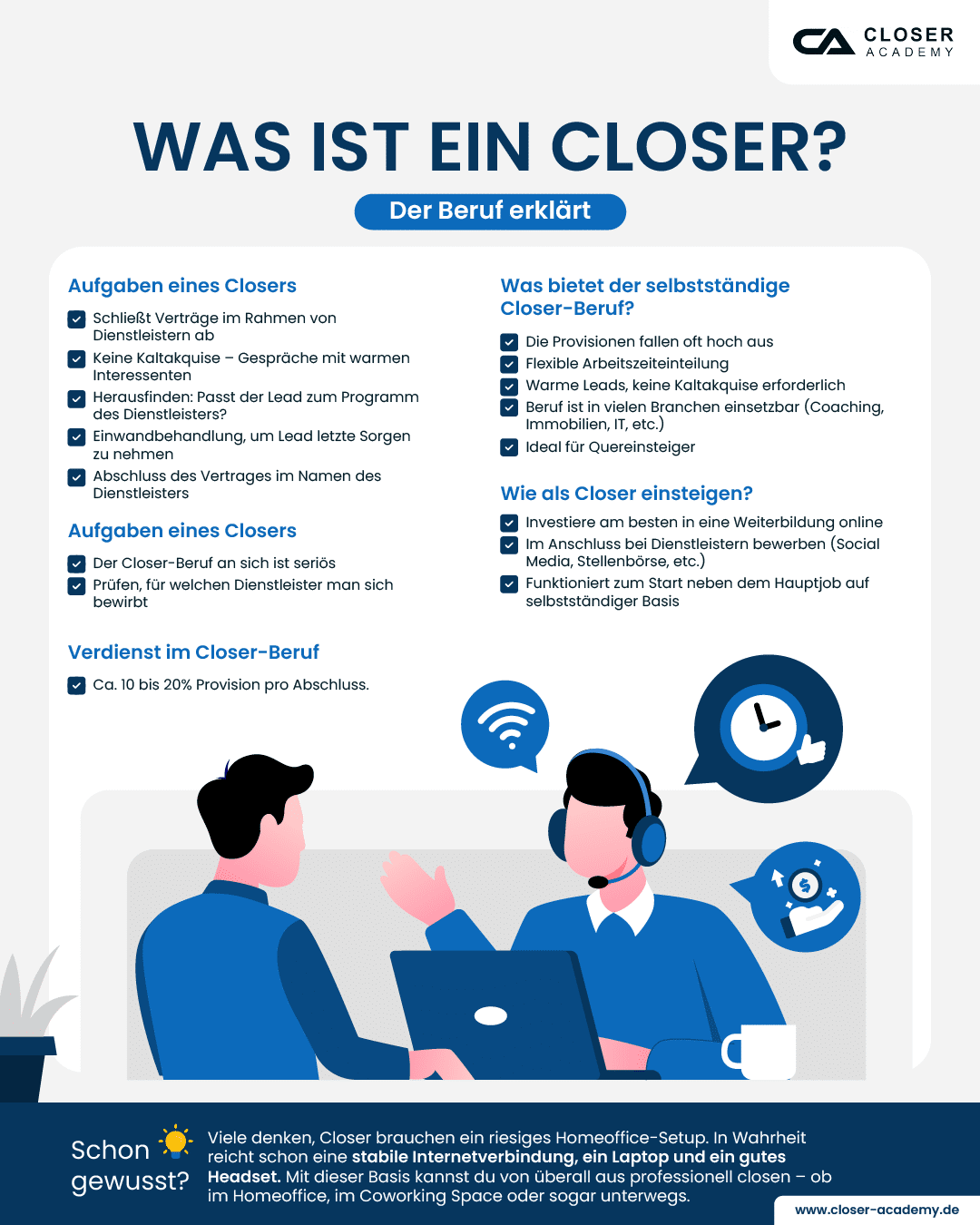 Wenn du einen Nebenjob von zuhause aus anstrebst und eine gute Internet- sowie Telefonverbindung vorzuweisen hast, hast du schon mal eine Grundbasis für eine Karriere als Closer. Bestenfalls hast du eine Karriere im Verkauf oder Vertrieb vorzuweisen; das ist aber nicht zwingend notwendig. Bist du motiviert, hast ein gesundes Selbstvertrauen und arbeitest gerne mit Menschen? Dann ist der Closer-Job das Richtige für dich. Du möchtest ein Beratungsgespräch buchen? Hier findest du die richtigen Ansprechpartner, die dir in einem Beratungsgespräch alle Fragen beantworten.